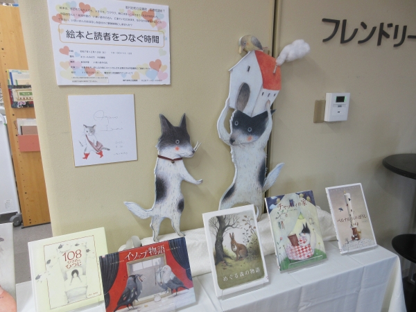 図書館入口テーマ展示 ~図書館講座7 絵本と読者をつなぐ時間~図書館講座7「絵本と読者をつなぐ時間」にあわせて、いまいあやのさんの絵本を展示しています。貸出も可能ですので、どうぞお手に取ってご覧ください。絵本「チャッピィの家」に登場する、チャッピィのパネルも展示中!可愛いチャッピィを見に来てくださいね。講座は12/13(土)に開催いたします。この機会にぜひお申し込みください。